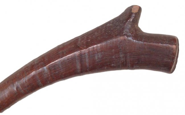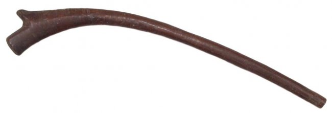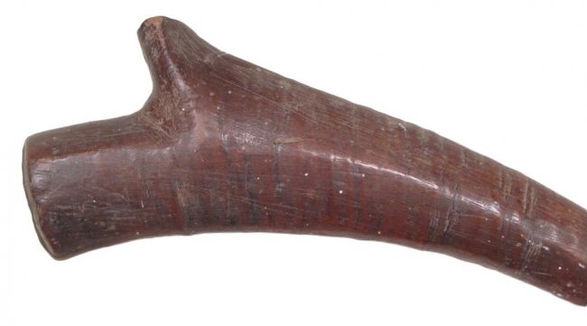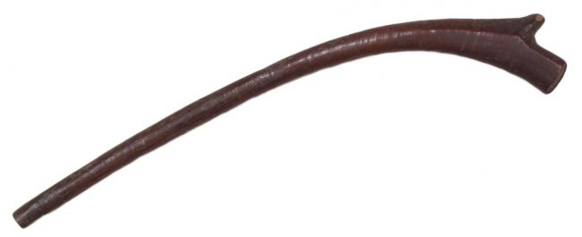 An earlier than average example, carved of a large, actively-grained hardwood limb. The characteristic expanded head with central ridge to either side, deeply notched, with a short crest at the tip. Good patina. 19th century or earlier. Worn, head chipped. Condition III