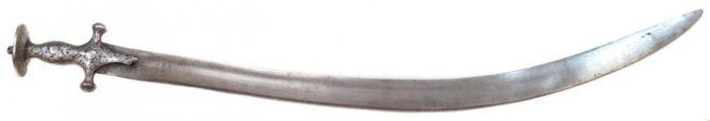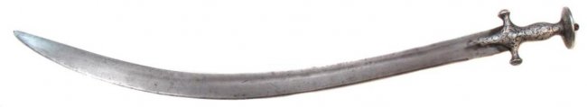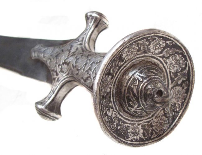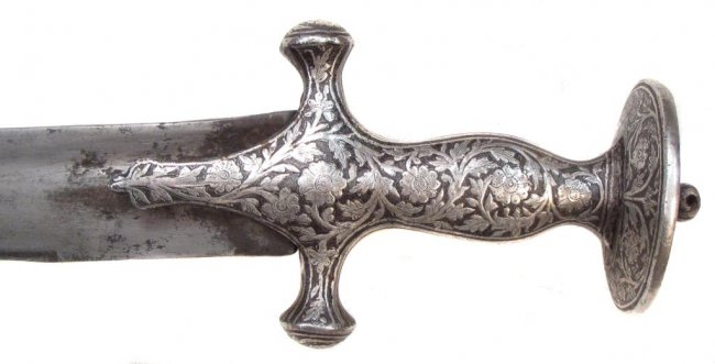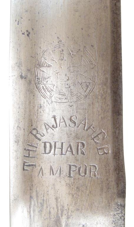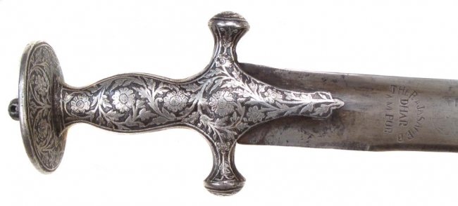 A massive example, the iron hilt finely inlaid in elaborate silver flowering vinework overall. The broad blade forged of pattern-welded damascus steel , with narrow fuller at the spine and expanded tip, chiseled at the right forte with Surya, the Hindu God of the Sun, and inscribed, THE RAJAH SAHEB DHARAMPUR. Beginning of the 19th century. Light wear. Presented by the Raja of Dharampur, the English inscription indicates the recipient was British, probably a high-ranking officer present on the occasion of the elevation of Dharampur to a British Protectorate on December 31, 1802. Surya the Sun God was the device of the ruling family, who were members of the Rajput Sisodia Dynasty. Surya remains the Dharampur state emblem and is depicted on its flag. Condition II